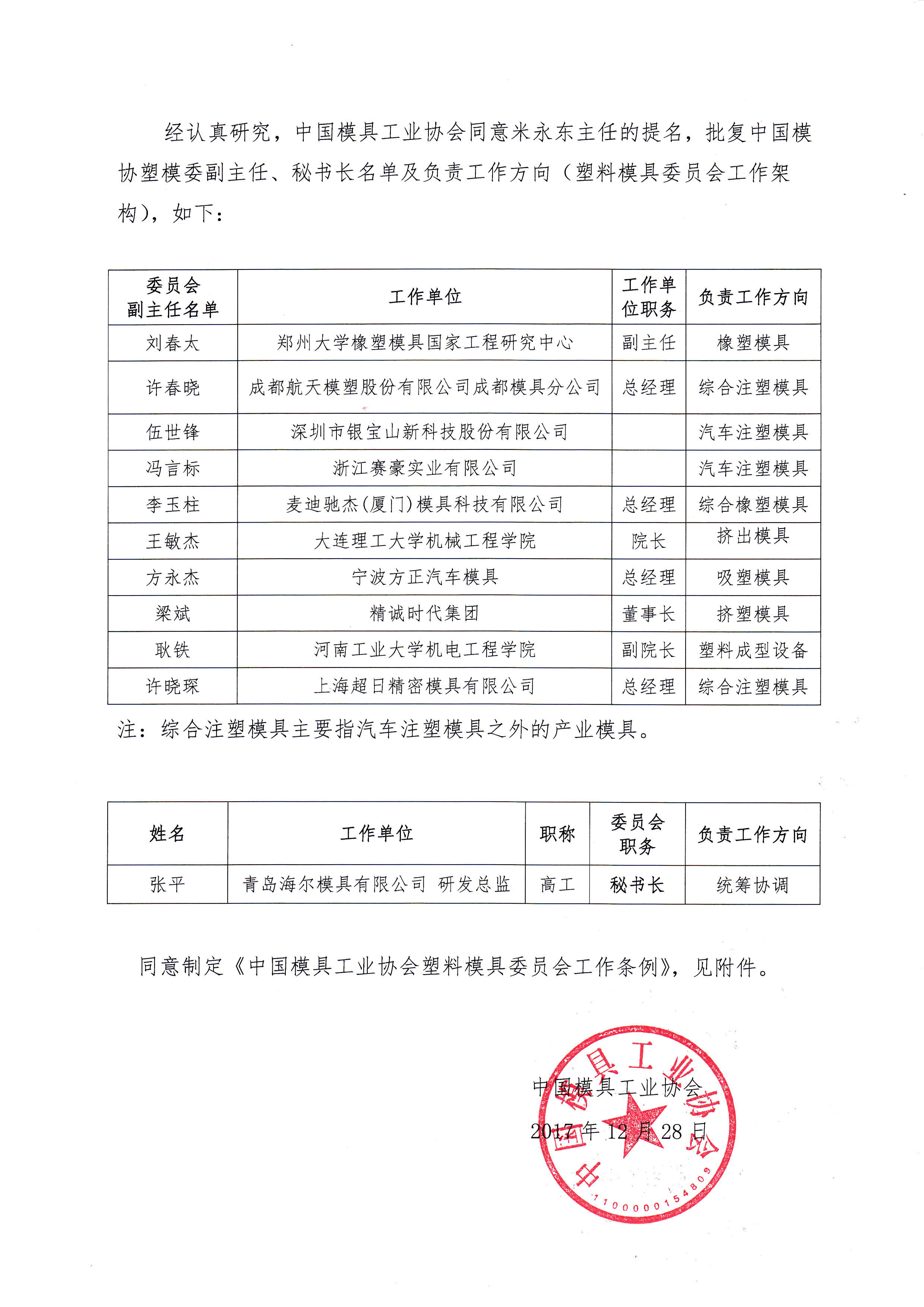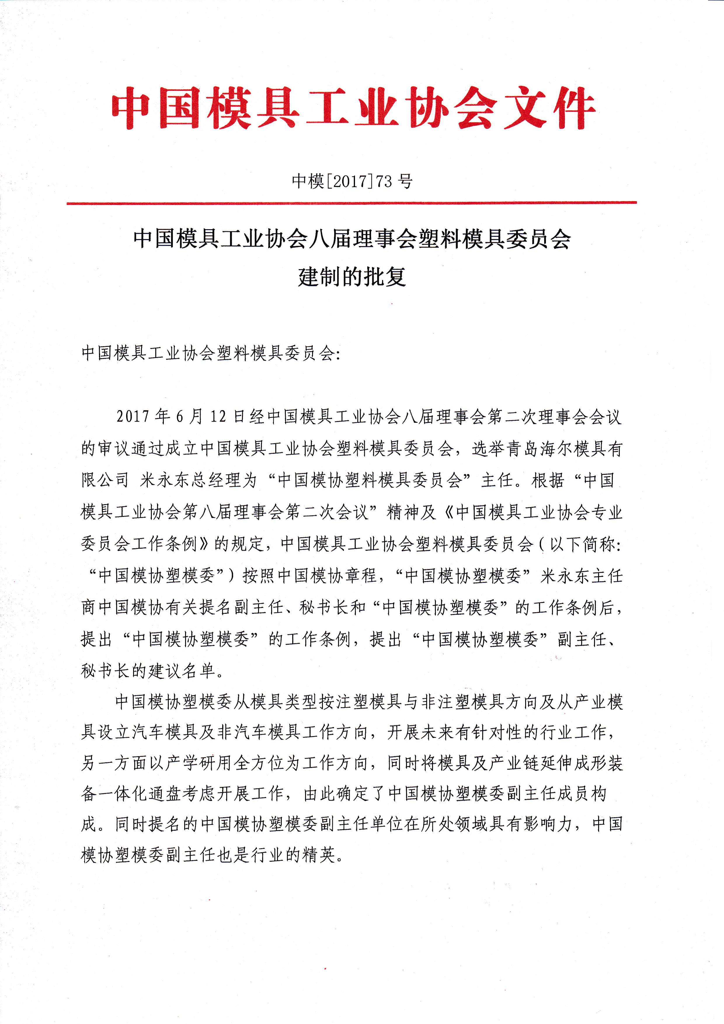 中國模具工業(yè)協(xié)會八屆理事會塑料模具委員會建制的批復