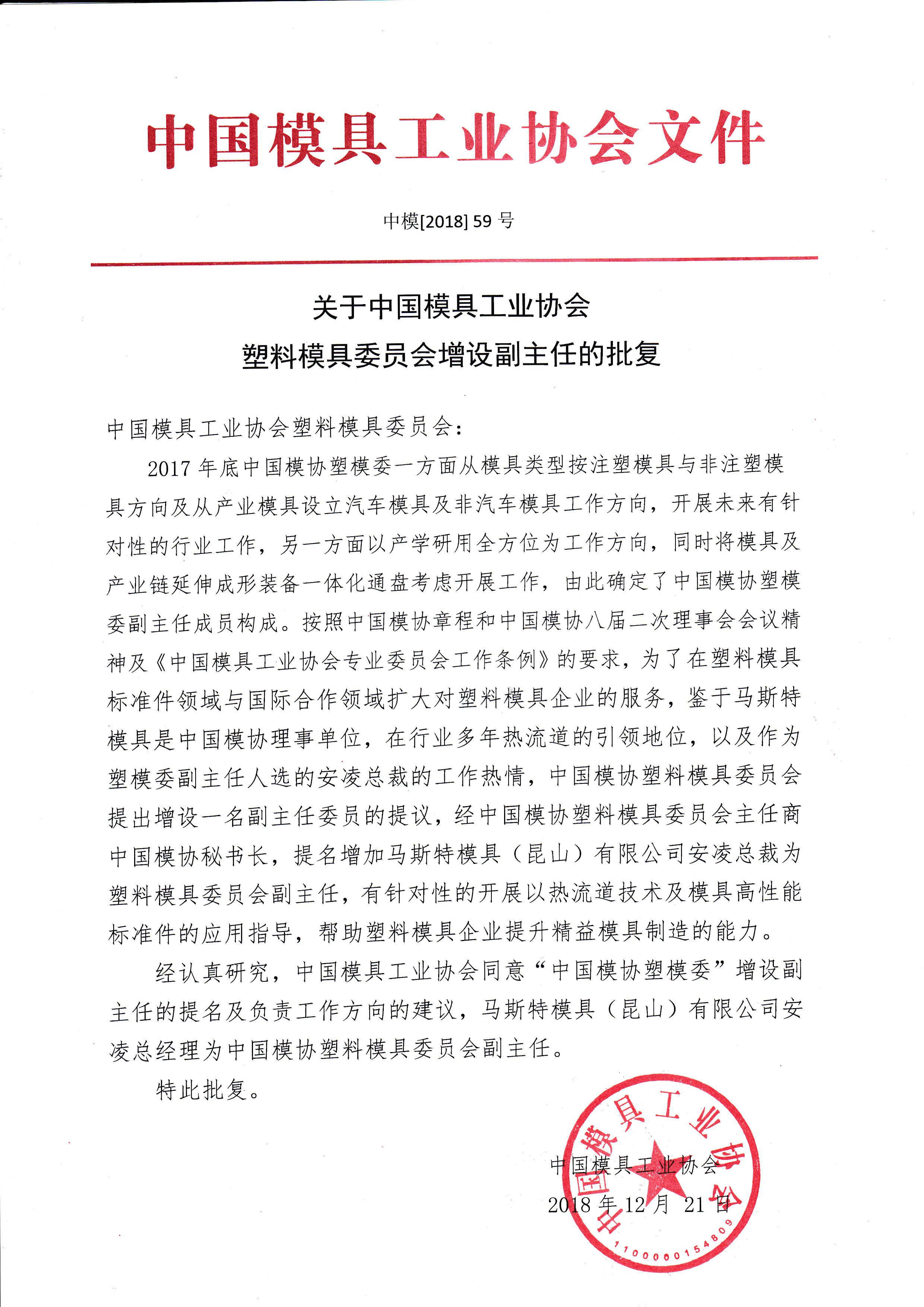 關(guān)于中國(guó)模具工業(yè)協(xié)會(huì)塑料模具委員會(huì)增設(shè)副主任的批復(fù)